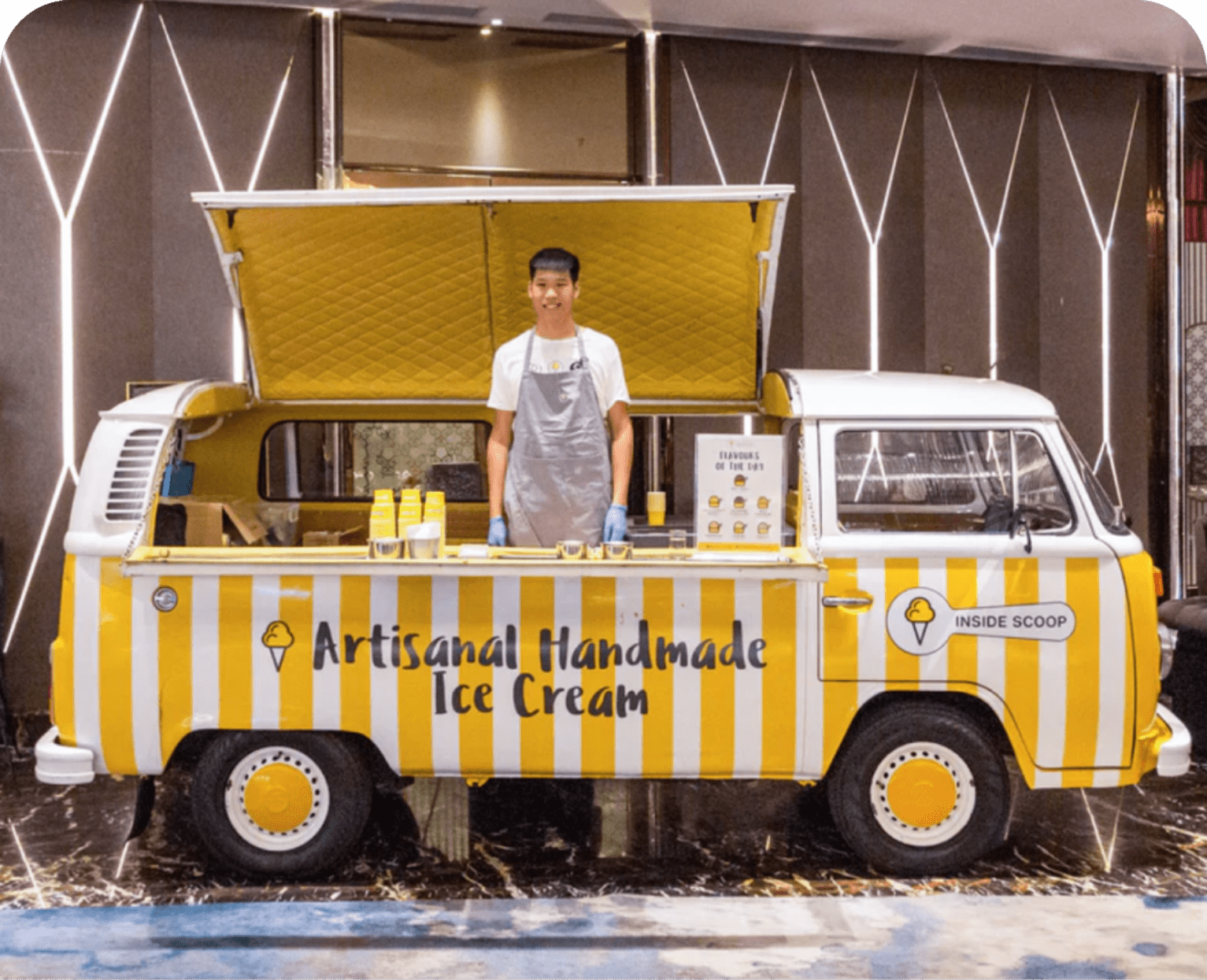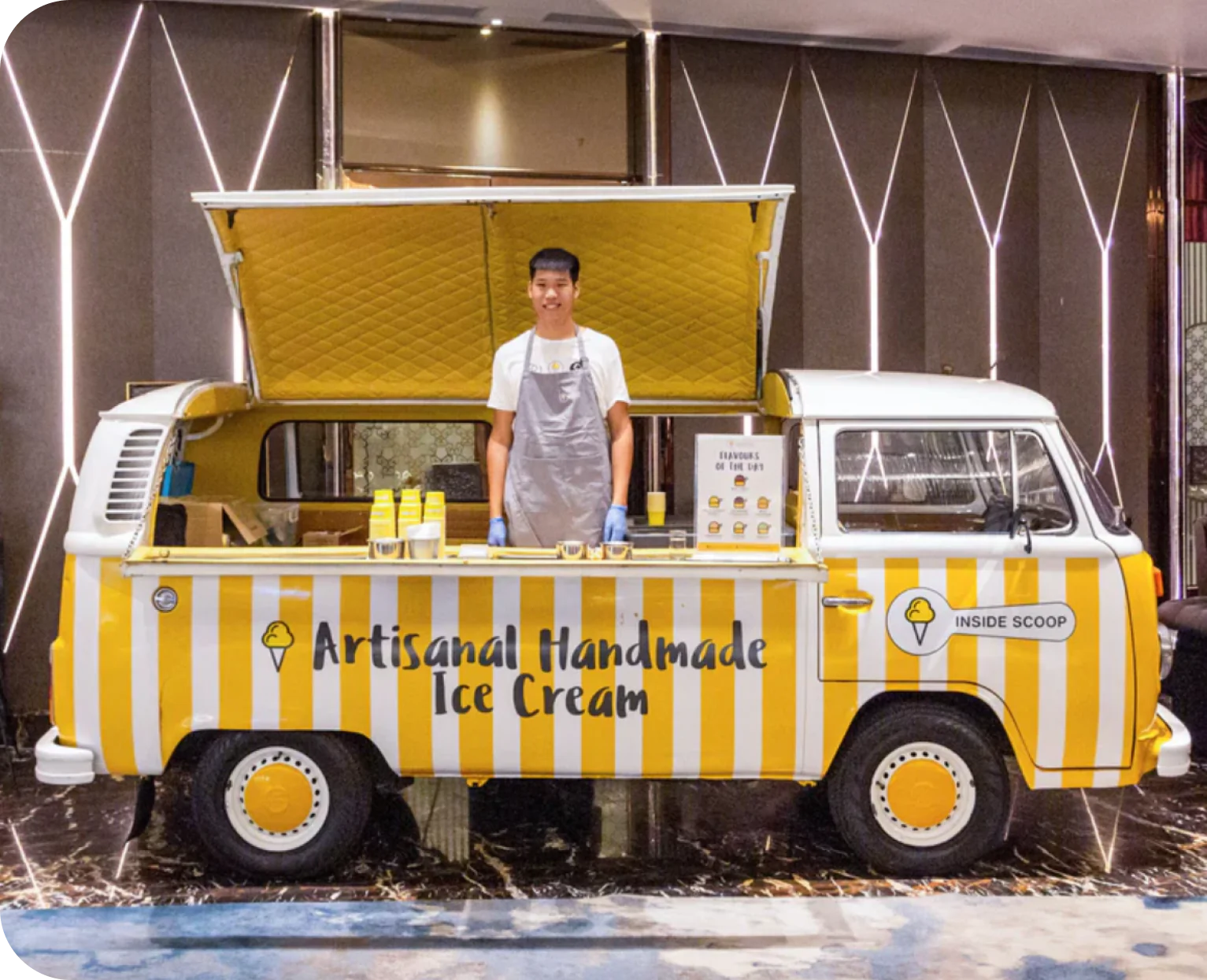 Coolest and most fun option! Ideal for corporate functions, weddings, or any celebration. We scoop on demand from a mobile freezer, just like an Inside Scoop outlet!